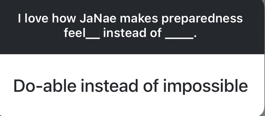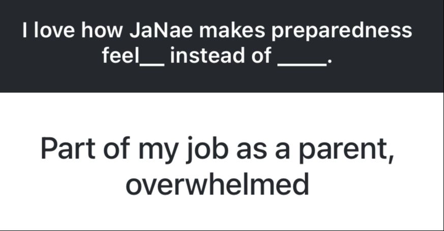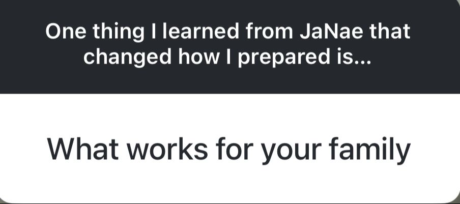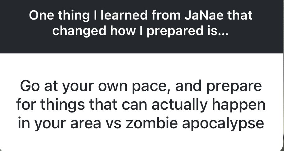 "In the few short years that I have known JaNae, she has demonstrated nothing but genuine care and concern for people’s well being and wanting to help them become better prepared to face whatever emergency, disaster, or event that they face in life. As a wife and mother of 4 young kids, her life is already busy and full, yet she dedicates time to help anyone who asks it of her. She is more than a preparer, she is a nurturer, and she demonstrates that as she gives of her personal resources to help others. For these reasons, I support JaNae in her efforts with Prepared Like a Mother and her Inner Circle."